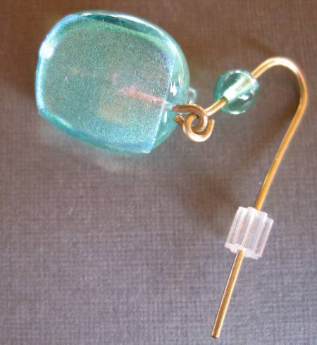The aqua glass is enhanced by the aqua dichroic base glass. Top front is gold and the stripe has a tint of blue.